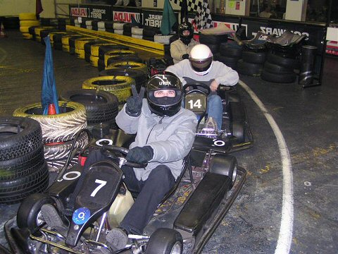 Die Überraschung war gelungen, Pierre hatte keine Ahnung und war völlig erstaunt als um 18 Uhr so nach und nach die Hütte bei ihm immer voller mit unangekündigtem Besuch wurde. Ab 19 Uhr gings dann mit den Karts los. Gefahren wurden insgesamt 7 Runden, wobei nur in Runde 4 alle Teilnehmer zusammen gefahren sind. Sonst hat immer mindestens ein Markus gefehlt. Die 7te Runde läuft außer Konkurenz und wurde von Ralf, Andreas und mir als einzige nicht bis zum Ende gefahren. Zum Schluss gings noch zum Mampfen ins Yours nach Wiesbaden, wobei aber allen „das Fahren“ noch in den Knochen steckte. Letztendlich waren wir nach einem gelungenen Abend um 2.30 tatsächlich ne Stunde vor den Mädels zu Hause. Schande.